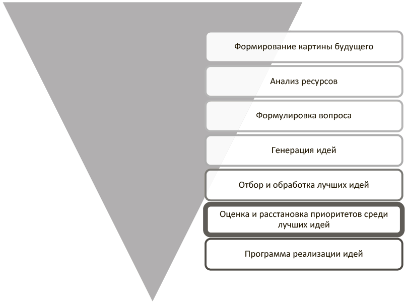 Необходимо помнить о том, что далеко не все предложения, сделанные к моменту завершения стадии «Генерация идей», будут полезны для бизнеса и обеспечат ему прорывное развитие. Если пропустить стадии «Отбор и обработка лучших идей» и «Оценка и расстановка приоритетов среди лучших идей», возникает риск потери ресурсов компании при реализации случайных идей, получивших высокую эмоциональную оценку, но не рассмотренных в ключе получения реальной пользы для достижения желаемой картины будущего.