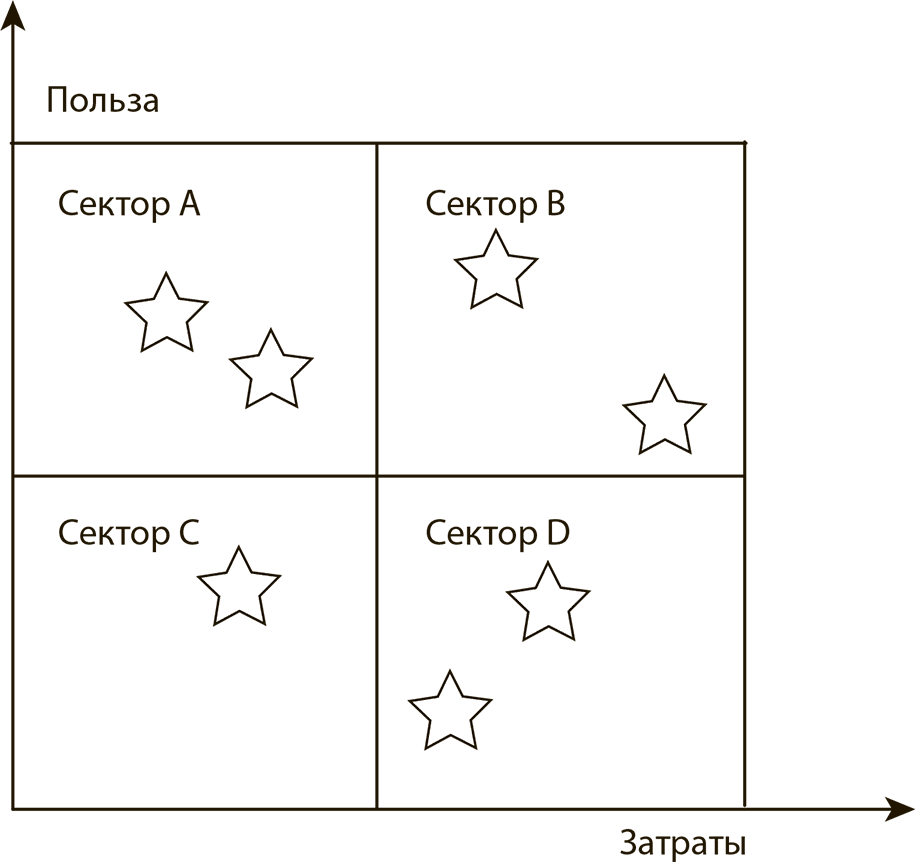 • сектор А – высокая польза и низкие затраты при реализации идеи;