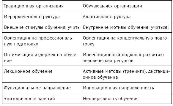 Отнесение знаний, компетенций к стратегическим ресурсам обусловило потребность в применении новых подходов к управлению знаниями как нематериальными активами. В начале 1990-х гг. в развитых странах формируется концепция обучающейся организации. Определяющим отличием обучающейся организации является ее нацеленность на непрерывное обучение персонала, поиск и создание возможностей и условий для развития и реализации потенциала собственных сотрудников, стремление к постоянному повышению уровня их компетенций как конкурентных преимуществ компании.