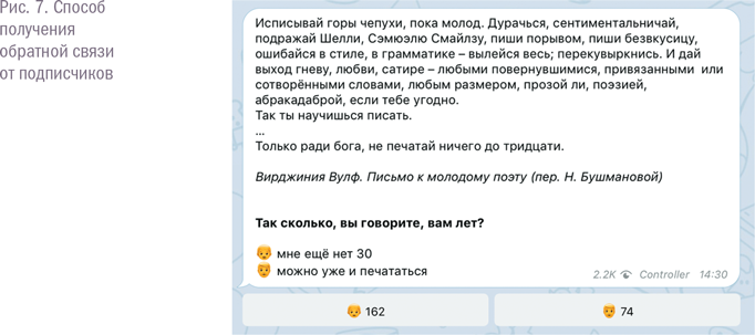 Если в других сетях, таких как «ВКонтакте» или Facebook, подписчики могут комментировать публикации или хотя бы ставить лайки, то здесь для этого нужно настраивать ботов (о них я подробнее расскажу ниже). По умолчанию единственная метрика, на которую можно ориентироваться, помимо охвата поста, – отписки. Да, в отличие от других соцсетей, в Telegram нужно обращать внимание на количество отписавшихся за сутки после публикации. Если больше 1 % аудитории решило с вами распрощаться, пост явно «не зашел».