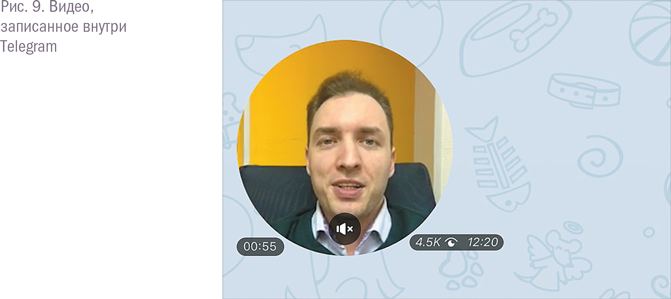 Telegram позволяет записывать видео внутри площадки (30-секундные ролики в круглой рамке), загружать в чаты и на каналы видеофайлы с вашего девайса и встраивать видео с YouTube (для этого нужно просто скопировать ссылку в чат или на канал). Также есть возможность добавления gif-файлов, музыки, статей из «Википедии». Это делается с помощью команд @gif, @youtube, @wiki, @music и пр.