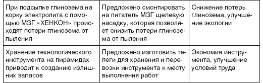 Внедрение машины «HENCON» для загрузки фтористых солей в бункера АПГ (автоматическая подача глинозема) позволило снизить потери при транспортировке. Расход A1F3 снизился на 2–3 кг на тонну алюминия.