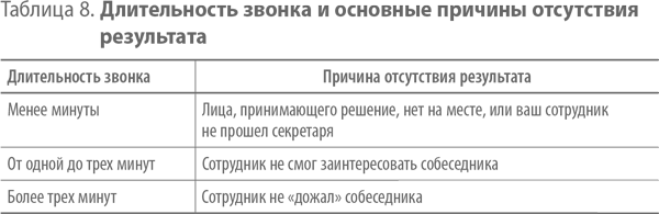 Практика показывает, что существует взаимосвязь между продолжительностью телефонного разговора и причиной, по которой не был достигнут результат (табл. 8).