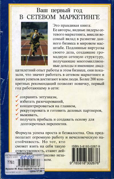 Если вам понравилась эта книга, пожалуйста, покажите ее еще нескольким вашим знакомым, возможно, они ее отдадут еще большему числу своих знакомых. И вполне может оказаться так, что сетевой маркетинг станет крупнейшей сферой бизнеса, которая затрагивает такие области, как производство и распространение предметов личной гигиены, товаров для дома, витаминных добавок, а также здравоохранение, телекоммуникации, экология, образование, совершенствование личности и многое другое. Таковы перспективы развития сетевого маркетинга; и мы предсказываем, что это произойдет в ближайшие десять лет. Уже в XXI веке сетевой маркетинг будут отличать две вещи: 1) наличие эффективных стратегий маркетинга и 2) установление таких взаимоотношений между распространителями, которые можно охарактеризовать как чувство локтя и порядочность.