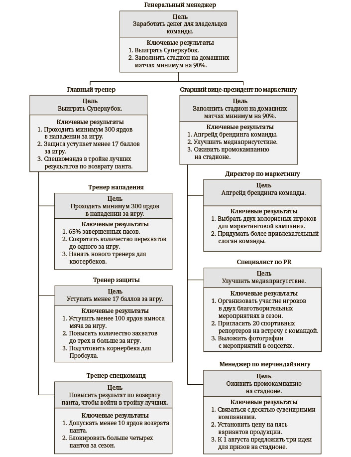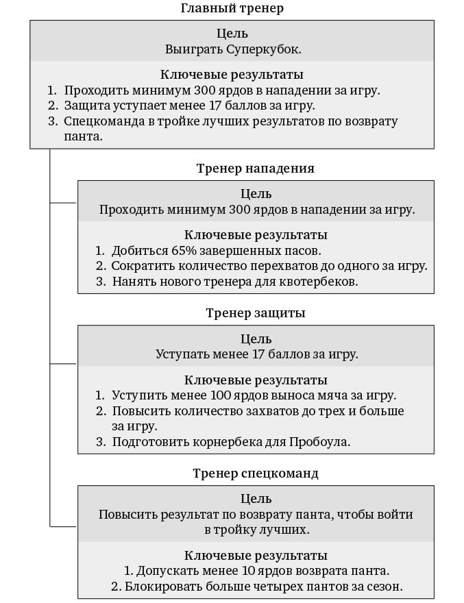 Как генеральный менеджер я спускаю свои цели вниз на следующий уровень менеджмента, главному тренеру и старшему вице-президенту по маркетингу. Мои ключевые результаты становятся их целями (см. OKR схема 2). Задача главного тренера – выиграть Суперкубок с тремя ключевыми результатами, которые помогут добиться цели: атака с проходом минимум 300 ярдов за игру, защита уступает меньше 17 баллов за игру и попадание в три лучших результата по возврату пантов. Тренер спускает эти ключевые результаты в качестве целей своим трем главным управляющим, координаторам нападения и защиты и тренеру спецкоманд. Они, в свою очередь, формулируют собственные ключевые результаты. Чтобы добиться атаки с прохождением 300 ярдов за игру, к примеру, координатор нападения стремится к 65 % завершенных пасов и не более чем одному перехвату за игру – после того, как наймут нового тренера для квотербеков.