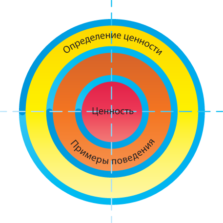 Мы предлагаем вам довольно простой алгоритм, который позволит качественно проработать и описать ценности. На первом этапе управленческая команда и ключевые сотрудники должны набросать список корпоративных ценностей, которые уже существуют в компании и которые они готовы культивировать следующие три-пять лет. Затем команде следует определить, есть ли такие ценности, что компания не поддерживает и не развивает сейчас, но хотела бы приобрести в будущем. Наконец, по каждой из них нужно нарисовать «ценностную мишень» с описанием по трем пунктам:
