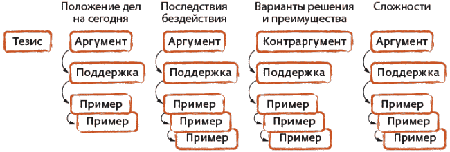 Классический способ. Основная масса выступлений строится на описании одного предлагаемого варианта действий и его преимуществ, а затем – последовательного представления поддержек и примеров.