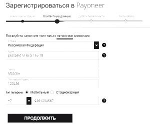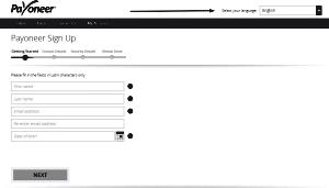 Заходим на https://payoneer.com, выбираем русский язык вверху справа, затем нажимаем кнопку «Регистрация».