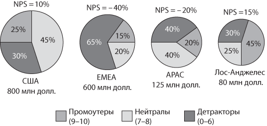 Затем специалисты компании провели сегментацию клиентов по регионам. Было очевидно, что высокая концентрация детракторов наблюдается в нескольких подразделениях, расположенных в определенных географических зонах. В регионах EMEA и APAC[13] (оба подразделения с многомиллионным оборотом) был достаточно большой сегмент детракторов по сравнению с другими зонами (рис. 2.4). Анализ комментариев клиентов показал, что одно подразделение отличается от всех остальных. Незадолго до проведения опроса группа поддержки клиентов EMEA была выведена и перенесена в отдаленную локацию, что оказало неожиданно сильное негативное воздействие на клиентский опыт. Руководители АВС, которые знали об этом переносе, не представляли себе его влияния на клиентский опыт, поэтому они немедленно попытались исправить ситуацию, например, с помощью обучения сотрудников из отдаленной службы поддержки клиентов.
