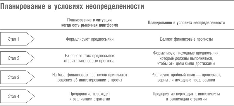 Типичная процедура планирования складывается так: сначала перечисляют множество предпосылок; на основе этих предпосылок формулируют прогнозы; на основе прогнозов строят план; а затем действуют в соответствии с этим планом. Такая процедура планирования идеально подходит для сложившихся рынков, где компания может получить разнообразные данные и где она уже обладает некоторым опытом.