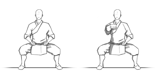 • Немного согните колени и разведите в стороны локти.