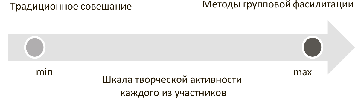 Методы групповой фасилитации представляют собой комплекс творческих и логических приемов для совместного поиска идей и принятия решений, в обсуждение которых максимально вовлечен каждый из участников сессии. Использование фасилитационных методов способно раскрыть творческий потенциал как отдельных сотрудников, так и коллектива единомышленников в целом. Формат фасилитационной сессии уже сам по себе предполагает открытый диалог между участниками управленческой команды, на основе которого как раз и принимаются системные стратегические решения. Именно в этом и заключается качественное отличие фасилитационной сессии от традиционных совещаний, когда некое деловое предложение, единолично высказанное кем-то из авторитетных участников, тут же ставится на групповое голосование.