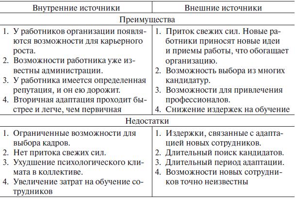Таблица 5.1. Преимущества и недостатки внутренних и внешних источников набора персонала
