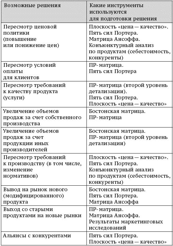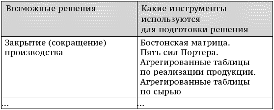 Таблица 2.22. Инструменты, используемые для подготовки решений, и возможные решения