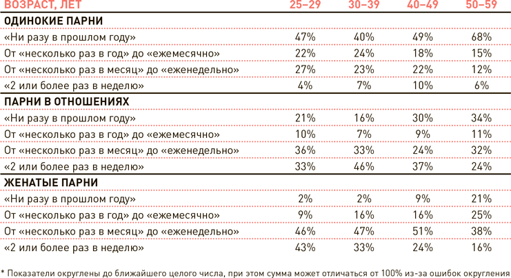 Как часто ты занимаешься сексом? Правильного ответа на этот вопрос не существует: секса должно быть столько, сколько вы со своей половинкой хотите. «Наряду с едой и сном секс является базовой, неотъемлемой частью человеческой природы», – отмечает доктор наук Лиза Даймонд, профессор психологии из Университета штата Юта в Солт-Лейк-Сити. И в этом качестве частота сексуальных контактов в твоей жизни говорит о состоянии твоего физического и психического здоровья. Если твое либидо снизилось, причиной может быть клиническая депрессия. Нарушение эрекции время от времени случается у большинства парней, но, если это происходит регулярно и даже при мастурбации, беги к доктору. Открой главу 10 – там есть план по совершенствованию твоей сексуальной жизни. А если вдруг тебе станет интересно, как часто ныряют в постель другие парни, то вот данные, собранные Институтом Кинси.