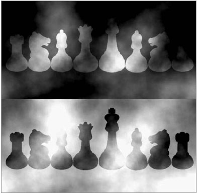Какого цвета шахматные фигуры в верхнем и нижнем рядах? Большинство отвечает, что в верхнем ряду фигуры белого цвета, а в нижнем – черного. Но это не так, цвет фигур в верхнем и нижнем рядах одинаков. Просто цвет фигур каждого ряда вы оцениваете в зависимости от цвета фона. Фигуры в верхнем ряду кажутся нам белыми, так как они нарисованы на черном фоне. И наоборот – фигуры нижнего ряда кажутся нам черными на белом фоне.