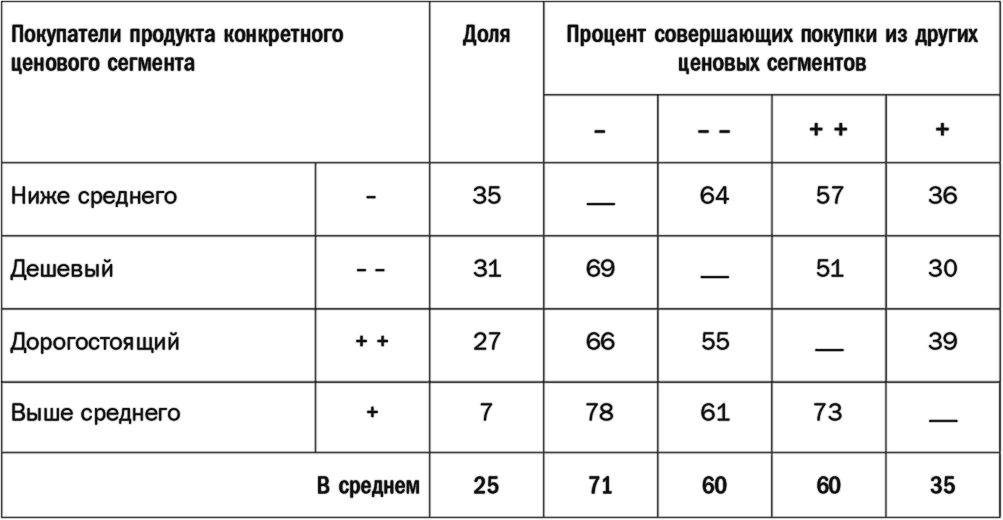 Примечание. 1. Ценовые сегменты в строках и столбцах располагаются в порядке убывания популярности. 2. Покупатели продукта любого ценового сегмента также покупают этот продукт из других ценовых сегментов в примерном соответствии с долей рынка этих ценовых сегментов.
