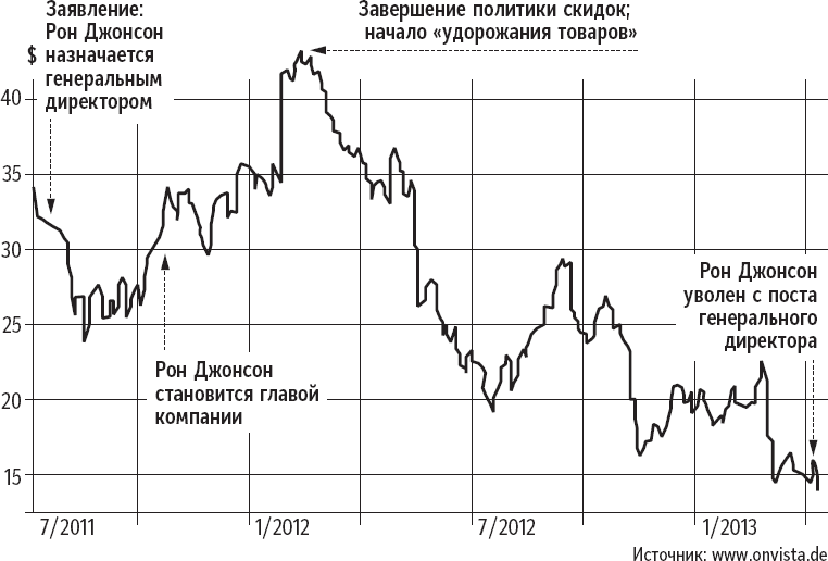 Доход компании J. C. Penney упал на 3 % за 2012 финансовый год, а расходы выросли из-за внедрения стратегии «удорожания товаров». Помимо всего прочего, прибыль в $378 млн в 2011 году обернулась убытком в $152 млн в 2012 году. Когда компания объявила о приходе Джонсона в середине 2011 года, курс акций отреагировал положительно. Как показывает рис. 24, курс акций резко упал после внедрения новой ценовой стратегии. С 30 января 2012 года по 2 апреля 2013 года курс акций компании рухнул с $41,81 до $14,67, то есть на 65 %. В тот же период индекс Доу-Джонса вырос на 16 %. Без комментариев. Чем же все закончилось? Рона Джонсона уволили в апреле 2013 года. К 2015 году курс акций опустился ниже $10.