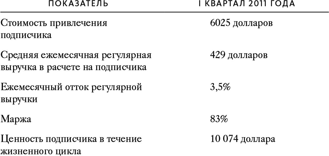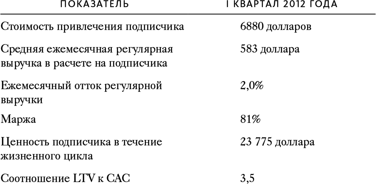 Что же изменилось за этот год? Как HubSpot удалось добиться жизнеспособности своего бизнеса по подписке? На первый взгляд, результаты на конец первого квартала 2012 года не сильно отличаются от показателей первого квартала 2011 года: валовая прибыль по-прежнему чуть превышает 80 процентов. Стоимость привлечения клиента больше 6000 долларов и даже немного повысилась. А вот средняя ежемесячная регулярная выручка в расчете на подписчика выросла на 36 процентов. Особенно существенно изменился коэффициент оттока подписчиков: он уменьшился с 3,5 до 2 процентов. Этого удалось добиться благодаря внедрению более эффективных практик вовлечения подписчика в работу, привлечению крупных компаний в качестве подписчиков и других приемов, о которых мы поговорим подробнее в главе 15, когда будем обсуждать способы снижения оттока подписчиков.