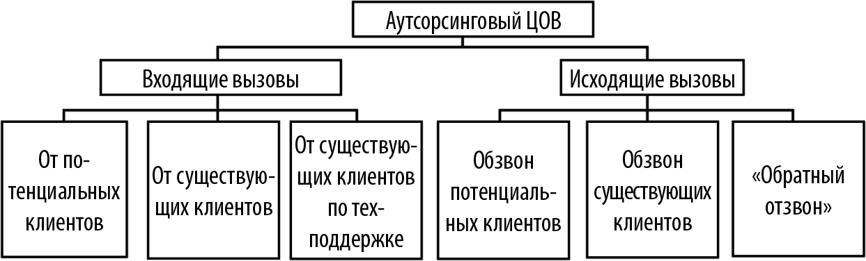 На рисунке 9.2 схематично представлены все виды вызовов, с которыми имеет дело аутсорсинговый операторский центр. Эта схема дана для удобства запоминания.