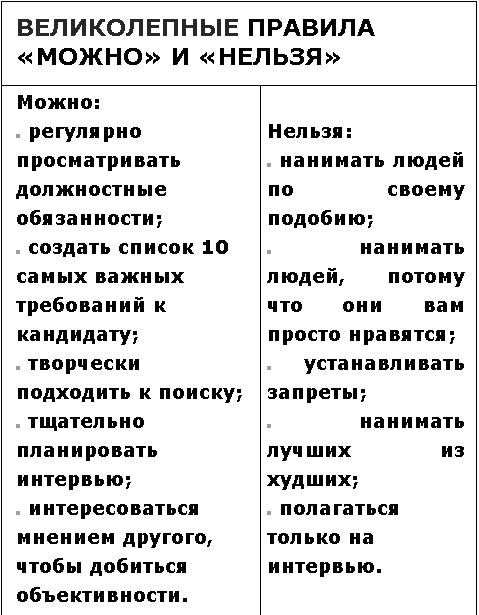 Интервью – процесс двусторонний. Кандидаты могут сознательно или непреднамеренно сделать для себя вывод относительно того, принять ли ваше предложение о работе, если оно последует после интервью. В некотором отношении кадровый менеджер продает работу, поэтому лучше это делать открыто и честно. Катастрофа, если, начав работать, сотрудник поймет, что новая работа не соответствует его представлениям. Должностные обязанности должны быть подробно описаны и, возможно, дополнительно разъяснены во время интервью, включая ваши ожидания, видение и некоторую информацию о компании.