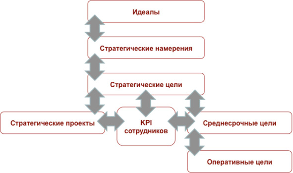 Цели, которые ставятся перед сотрудниками, формируются как результат индивидуализации стратегических, тактических и оперативных целей компании. Так, например, ответственность за достижение стратегических целей возлагается на топ-менеджеров. При этом ключевыми показателями их деятельности (KPI) становятся измеримые критерии выполнения стратегии компании. Для сотрудников устанавливаются показатели оперативного или тактического уровня и соответствующие KPI.