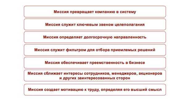 • Компания является областью пересечения интересов различных сторон – акционеров, клиентов, сотрудников, поставщиков и многих других. Их цели зачастую не совпадают или противоречат друг другу. Миссия определяет единую для всех основу сотрудничества, то общее, к чему стремятся все заинтересованные стороны, подчиняя свои интересы интересам общего дела.