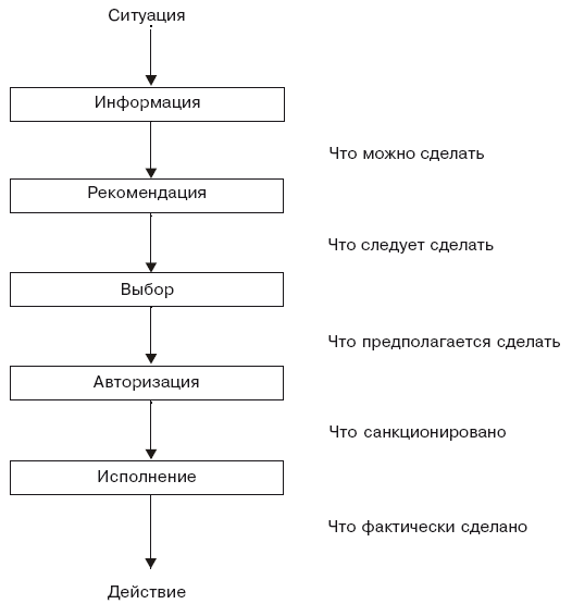 Но, прежде чем приступить к анализу распространенных в организациях типов децентрализации, нам необходимо рассмотреть еще один вопрос. Дело в том, что участвующие в принятии одного решения сотрудники обладают различными объемами власти. Понять, что в действительности имеется в виду под контролем над принятием решений, нам поможет некая принципиальная схема данного процесса.
