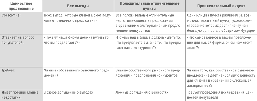 Поставщики используют термин «ценностное предложение» тремя разными способами. Большинство менеджеров просто перечисляют все выгоды, которые, по их мнению, можно принести целевой потребительской аудитории. Чем больше они вспомнят, тем лучше. Некоторые менеджеры признают, что у покупателей есть альтернативы, но они часто ошибаются, полагая, что положительные отличия от конкурентов должны иметь ценность для покупателя. Опытные поставщики базируют свои предложения потребительской ценности на немногочисленных элементах, имеющих наибольшее значение для целевой клиентской аудитории, показывают ценность их работы и сообщают об этом таким образом, что клиент получает глубокое понимание своих деловых приоритетов.