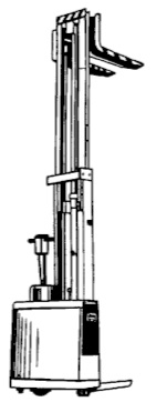Электроштабелеры (рис. 10) также относятся к машинам напольного безрельсового транспорта. Служат для выполнения складских работ в закрытых помещениях с твердым и ровным покрытием пола. Их используют, как правило, для работы в стесненных условиях при штабелировании грузов в высокие ярусы стеллажей. Загрузка груза в стеллажи и его выгрузка производится выдвижением грузоподъемника с вилочными захватами. Рама грузоподъемного механизма может наклоняться вперед и назад, что и обеспечивает возможность взятия груза из штабеля и укладку его в штабель. Выпускаются грузоподъемностью 0,8; 1; 1,25; 1,6 и 2 т.