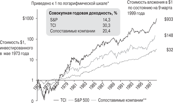 Мэлоун также удерживал контроль (шесть мест в совете директоров из девяти) над Liberty – дочерней компанией, занимающейся разработкой программ, и заключил привлекательную долгосрочную сделку о переводе каналов Liberty в кабельные системы AT&T. Эта сделка стала убедительным подтверждением уникальной стратегии Мэлоуна в TCI и принесла инвесторам поистине исключительную доходность. Судите сами: за 25 лет (с того момента, как Мэлоун возглавил TCI) индустрия кабельного телевидения сильно разрослась, а все публичные компании в ней процветали, но ни одна из них даже приблизительно не создала такой стоимости для акционеров, как это удалось сделать Мэлоуну. На рис. 4.1 показано, что с 1973 года по 1998-й, когда компания была продана холдингу AT&T, акционеры TCI получили феноменальную совокупную доходность в 30,3 % (для сравнения, за аналогичный период другие публичные компании отрасли смогли добиться 20,4 %, а индекс S&P 500 показал результат 14,3 %).