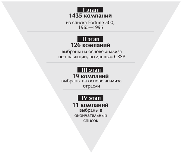 По результатам анализа было исключено восемь компаний: Sara Lee, Heinz, Hershey, Kellogg, CPC и General Mills примерно в 1980 году продемонстрировали стремительный взлет показателей относительно рынка, но не относительно средних показателей по пищевой отрасли; Coca-Cola и Pepsi значительно опережали рынок в 1960-м и потом снова в 1980-м, но не показали значительного роста относительно средних показателей по отрасли производства прохладительных напитков. Так осталось 11 компаний, которые удовлетворяли всем критериям четырех этапов и вошли в конечный список. (На момент исследования три компании не имели данных по доходности по акциям в течение полных пятнадцати лет: Circuit City, Fannie Mae, Wells Fargo. Данные собирали до тех пор, пока они не отвечали требованию «год T + 15», что удостоверяло их трехкратное опережение рынка в течение пятнадцати лет. Таким образом, эти три компании остались в списке.)