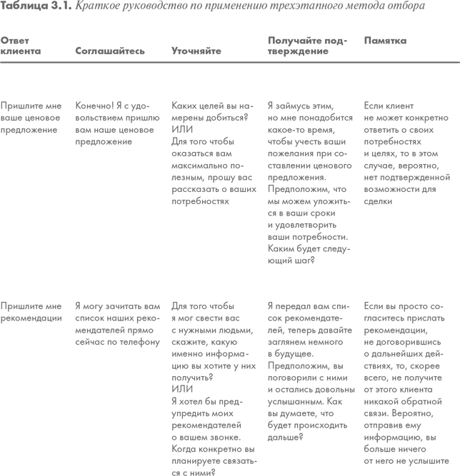 Авторы многих книг о продажах и методах продаж настаивают на том, что специалисты по продажам должны во что бы то ни стало доводить до конца каждую сделку. Это ошибочное мнение. Во многих случаях вы обнаружите, что здесь ничего не продать! Пытаясь навязать покупку, вы рискуете отпугнуть потенциального клиента в будущем, раздражая его. Кроме того, потратите драгоценное время и силы, не получив ничего взамен. Вот почему трехэтапный метод отбора так важен. Всего за несколько минут с помощью правильно составленных вопросов можно оценить, действительно ли потенциальный клиент заинтересован в том, чтобы иметь с вами дело. Вы сэкономите время и деньги, не говоря об осложнениях, которые могут возникнуть у вас или у потенциального клиента. Кроме того, ответы, полученные с помощью этого метода, снабдят вас ценной информацией о вашем потенциальном клиенте и его компании.