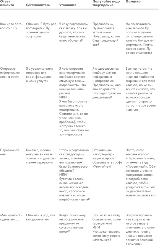 С помощью этих ответов вы сможете в будущем лучше подготовить предложение и представить его потенциальному клиенту. Они помогут вам предвосхитить наиболее вероятные возражения с его стороны и дадут вам возможность ответить на них. В таблице 3.1 представлена схема, которая позволит вам применить этот метод в самых разных ситуациях.