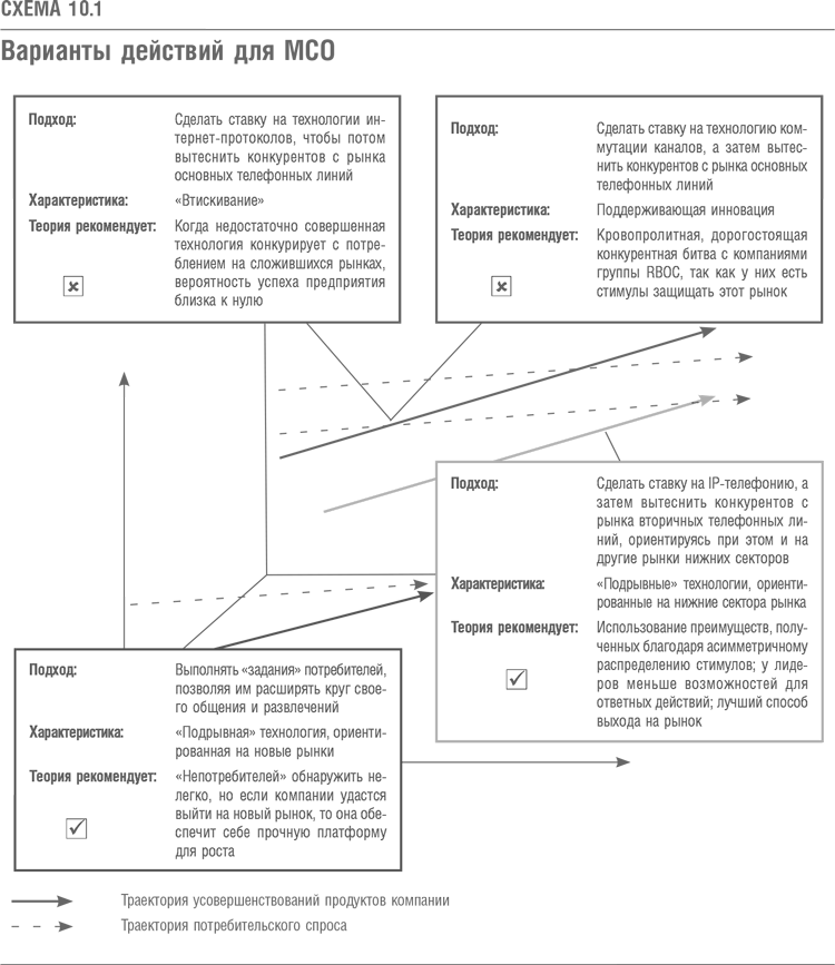 На схеме 10.1 представлены все варианты действий для кабельных компаний. Варианты типичны для такого случая. Компании могут выйти на сложившиеся рынки и конкурировать, выпустив поддерживающие инновации. Если их инновационный продукт имеет ограниченную функциональность, но зато несет потребителям новые блага, компания может выбирать: либо применить тактику «втискивания», когда продукт предлагается использовать в таких ситуациях, где его ограничения будут очевидными, либо предлагать такой продукт «подрывным» категориям потребителей.