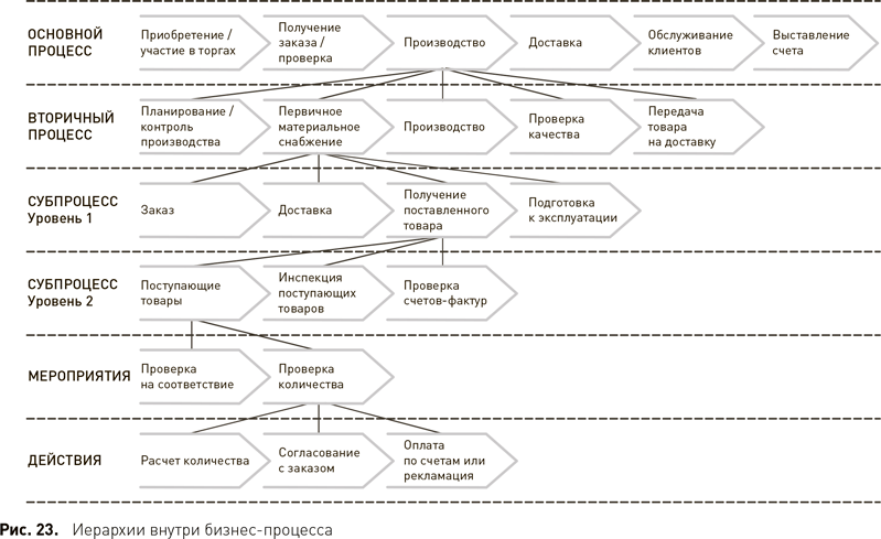 • Все эти процессы можно расположить в иерархическом порядке – как основные, вторичные, субпроцессы, мероприятия и действия. Каждым процессом можно управлять и оптимизировать его на основании результатов и отдельных действий, проводимых последовательно или параллельно (рис. 23). Бизнес-процессы, оптимизированные и стандартизированные таким образом, обеспечивают фундамент для быстрого роста, поскольку их легко воспроизвести при открытии новых филиалов и т. п.