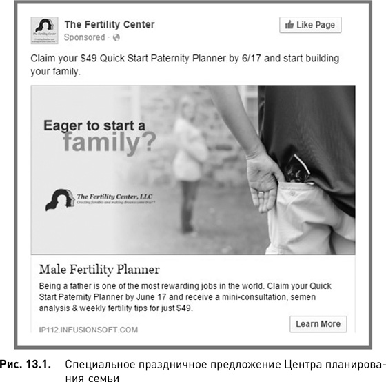 Значительная часть сообщений, рассылаемых от имени Центра планирования семьи, ориентирована на женщин, поскольку мы выяснили, что именно женщины чаще занимаются вопросами планирования семьи. Однако это не значит, что мы не можем работать и с потенциальными отцами. Так, на День отца мы разработали специальное предложение, не похожее ни на что из того, что делали наши конкуренты. Это предложение под названием «Планировщик отцовства» включало мини-консультацию, анализ семенной жидкости и еженедельные подсказки о шансах повысить вероятность зачатия (поскольку компания уже рассылала электронные письма на эту тему, нам не пришлось заниматься никакой дополнительной работой). При минимальных усилиях и затратах мы смогли привлечь к регистрации и покупке нашего предложения четыре семейные пары, то есть промо стоимостью $150 принесло нам около $100 000 потенциальной выручки. Кроме того, в рамках этой промоакции мы связывались с парами, имевшими проблемы с зачатием. Мы хотели помочь людям забыть о грустном в День отца и сделать следующий шаг в достижении цели – создании семьи (рис. 13.1).