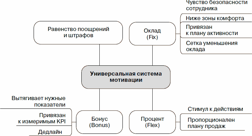 Универсальная система мотивации представляет собой синтез всех трех рассмотренных выше составляющих: минимального оклада, ограниченных процентов и бонусов за KPI (рис. 8.3).