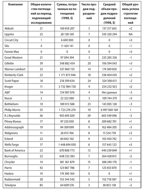 Чтобы заполнить эту таблицу, мы определили общее количество поглощений, осуществленных каждой компанией за десятилетие, предшествующее преобразованиям, и до 1998 года. Затем мы оценили каждое поглощение по шкале от ?3 до +3, основываясь как на финансовом, так и на качественном анализе, и рассчитали средний балл. В случае с Upjohn не удалось собрать достаточного количества данных, чтобы выполнить анализ, поэтому балл не был рассчитан.