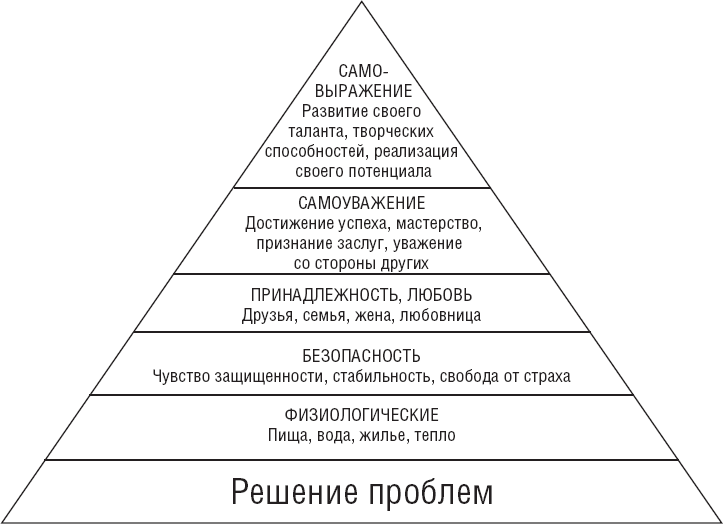Его непосредственные подчиненные поддразнивали его из-за этого. Они создали «Иерархию потребностей Джеффа», диаграмму, основанную на знаменитой пирамиде Абрахама Маслоу (рис. 2–2). Под нижней ступенью (физиологические потребности) они нарисовали еще одну и назвали ее «Решение проблем». Джеффу нравилась эта диаграмма. Она отражала то, каким ему хотелось видеть себя. Когда он занимался решением проблем, его основные потребности были удовлетворены: он чувствовал себя ценным, решительным, компетентным и влияющим на конечный результат.