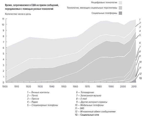 Несколько лет тому назад агентство McKinsey опубликовало оценки времени, затрачиваемого на потребление информации за период с начала века [346]. Люди читали книги и газеты, но в основном общались лицом к лицу. В следующем веке люди полюбили радиоприемники, телевизоры, компьютеры и мобильные устройства. Теоретически самое важное ограничение для медиа – это время: в сутках по-прежнему всего 24 часа. Однако каждое новое поколение тратит все больше времени на то, чтобы разговаривать, читать, смотреть и слушать. Новые платформы сталкиваются, образуя новые массмедиа.