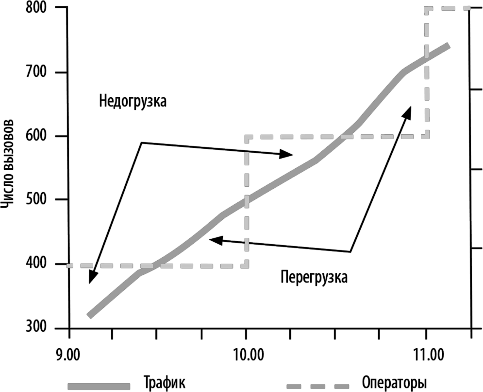 Как мы уже говорили, все операторские центры могут работать в двух режимах: при избытке вызовов и при избытке операторов. Естественно, управляющий персонал любого ЦОВ стремится к тому, чтобы работать при некотором избытке вызовов (во избежание непроизводительных затрат на заработную плату операторов). Но точно спрогнозировать условия поступления вызовов невозможно. (Мы подробно говорили об этом в главе 2.) Вот и получается, что даже в течение одного рабочего дня ЦОВ может работать в обоих режимах, причем ярко выраженных: и при сильном избытке вызовов, и при сильном избытке операторов (рис. 8.6). Естественно, это вызывает проблемы как с эффективным использованием труда операторов, так и с качеством обслуживания.