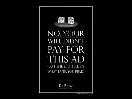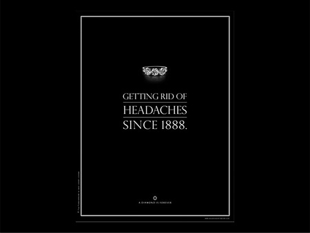 От цветов поэта возвращаемся к бриллиантам. Приведу еще несколько примеров, где рекламисты проявили тонкое понимание тайных граней семейной жизни. «Снимает головную боль с 1888 года» (рис. 86). Кстати, указанный год не случаен. Это дата основания компании, названной в честь братьев Де Бирс. Следующее объявление: «Нет, ваша жена не платила за эту рекламу. (Но она сказала нам, какие газеты вы читаете)» (рис. 87).