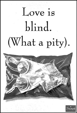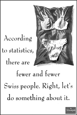Рядом с закрытым лифом и кружевными трусиками на ярко-красной бархатной подушечке читаем: «Любовь слепа. (Как жаль)» (рис. 92). «Согласно статистике, население Швейцарии сокращается. Что ж, давайте с этим что-то делать» (рис. 93).