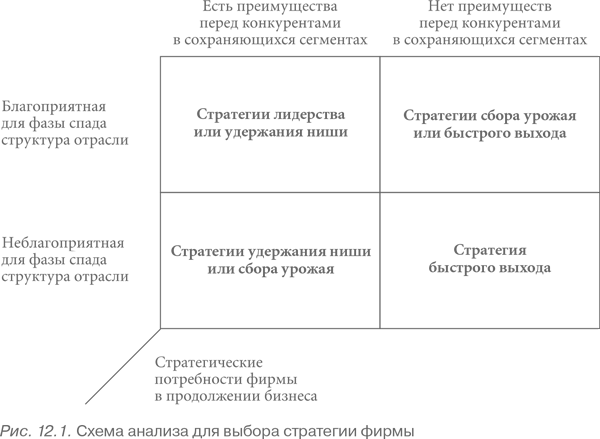 Если структура отрасли способствует благоприятному протеканию фазы отраслевого спада благодаря незначительной неопределенности, низким барьерам для выхода и т. д., фирма, обладающая преимуществами, может либо добиваться лидерства, либо защищать свою нишу – в зависимости от структурных условий, позволяющих конкурировать в большинстве сохраняющихся сегментов или требующих выбора одного или двух из них. Фирма, обладающая преимуществами, имеет шанс занять лидирующую позицию (конкуренты, проигрывающие борьбу, выйдут из отрасли), а коль скоро такая позиция достигнута, структурные условия позволят извлекать из нее выгоды. Если фирма не располагает конкретными преимуществами, она вряд ли способна захватить лидерство как в отрасли в целом, так и в отдельной нише, однако такая фирма может воспользоваться благоприятными условиями отрасли для прибыльного ведения стратегии сбора урожая. Она может также выбрать вариант раннего выхода, что будет зависеть от успешности сбора урожая и возможностей продажи бизнеса.