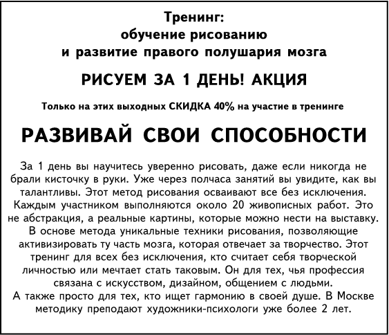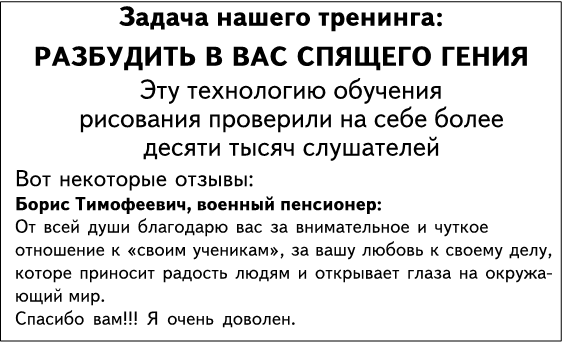 На оборотной стороне отзывы прошедших этот чудо-тренинг, обычных людей, не имеющих отношения к миру искусства.