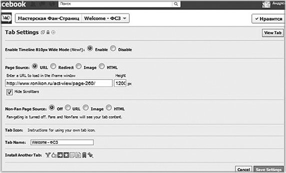 Это приложение имеет расширенный функционал по сравнению с предыдущим. Оно также легко добавляется на фан-страницу, при этом вы изначально видите сам контент вкладки, а потом можете переходить в настройки Settings (так удобней). Настроек в Static iframe больше. Если вы не знаете HTML, можете просто загрузить картинку, и она отобразится на вкладке (Page Source – Image). Можно сделать редирект сразу на сайт (Page Source – Redirect) или отобразить внутри вкладки любой внешний сайт, указав его ссылку (Page Source – URL). Также есть опция вставки контента для НЕфанов (Non-Fan Page Source).