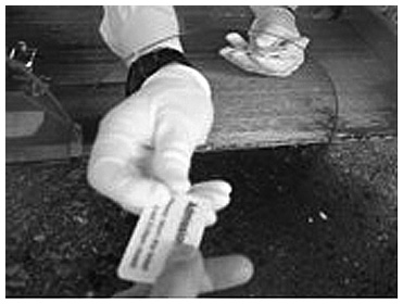 Цветущая вишня резко контрастировала с серыми зданиями делового Токио, его шумом и суетой, огромными толпами занятых людей и шумом транспорта. Сады были оазисом в сердце бетонных джунглей. Когда мы с семьей шли по мосту, к нам подошел пожилой японец с сумкой через плечо. Он полез в сумку и вынул пачку пластиковых карточек. Он предложил каждому из нас по одной, правда, задумался, нужна ли карточка моей трехмесячной дочери, сидевшей в слинге. Но в итоге вручил мне карточку и для нее. Он ничего не сказал, и я, плохо зная японский, тоже промолчал. Мы пошли дальше в сады подыскивать местечко для семейного пикника.
