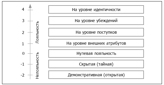 Лояльность же является показателем отношения личности к определенному объекту, иными словами, это принятие, положительное отношение человека к чему-то конкретному. В основе лояльности лежит прежде всего желание быть полезным, преданность объекту лояльности и избегание того, что может нанести ему вред (табл. 23).