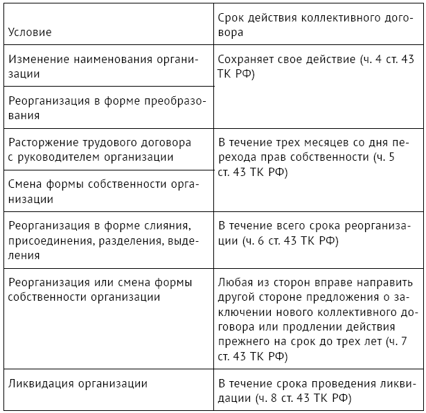 Трудовым законодательством определены обстоятельства, при наступлении которых коллективный договор продолжает или прекращает действовать (табл. 25).
